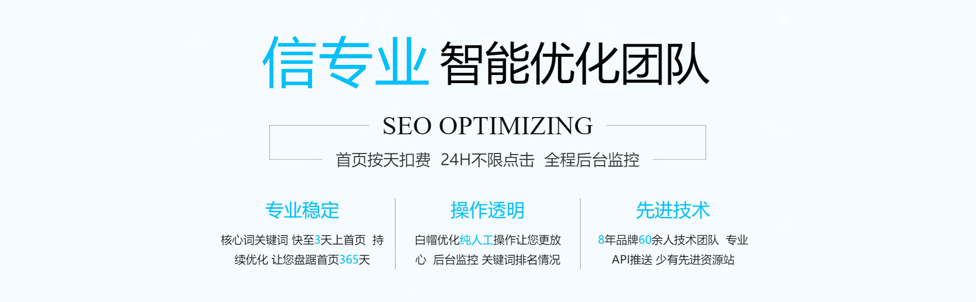 關鍵詞優化,無效果退款!專業技術管控賬戶,減少無效點擊,全方位網絡推廣,讓您的信息遍布互聯網。